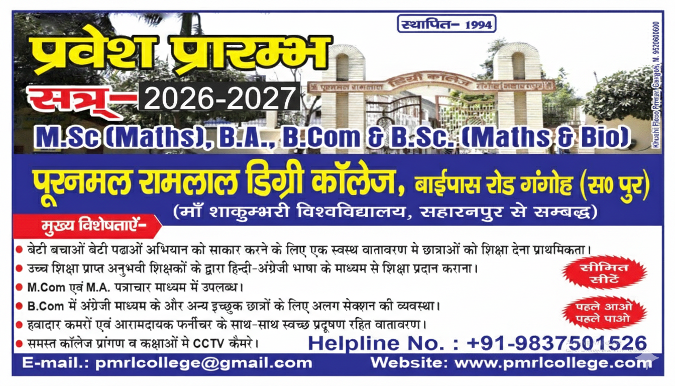 Welcome to PMRL Degree College. The College has been serving the residents of Gangoh and the nearby Community for over 24 years and we are proud of our service and commitment to educational excellence. Currently, one third of all Gangoh 12th class students who attend a college enroll at PMRL.